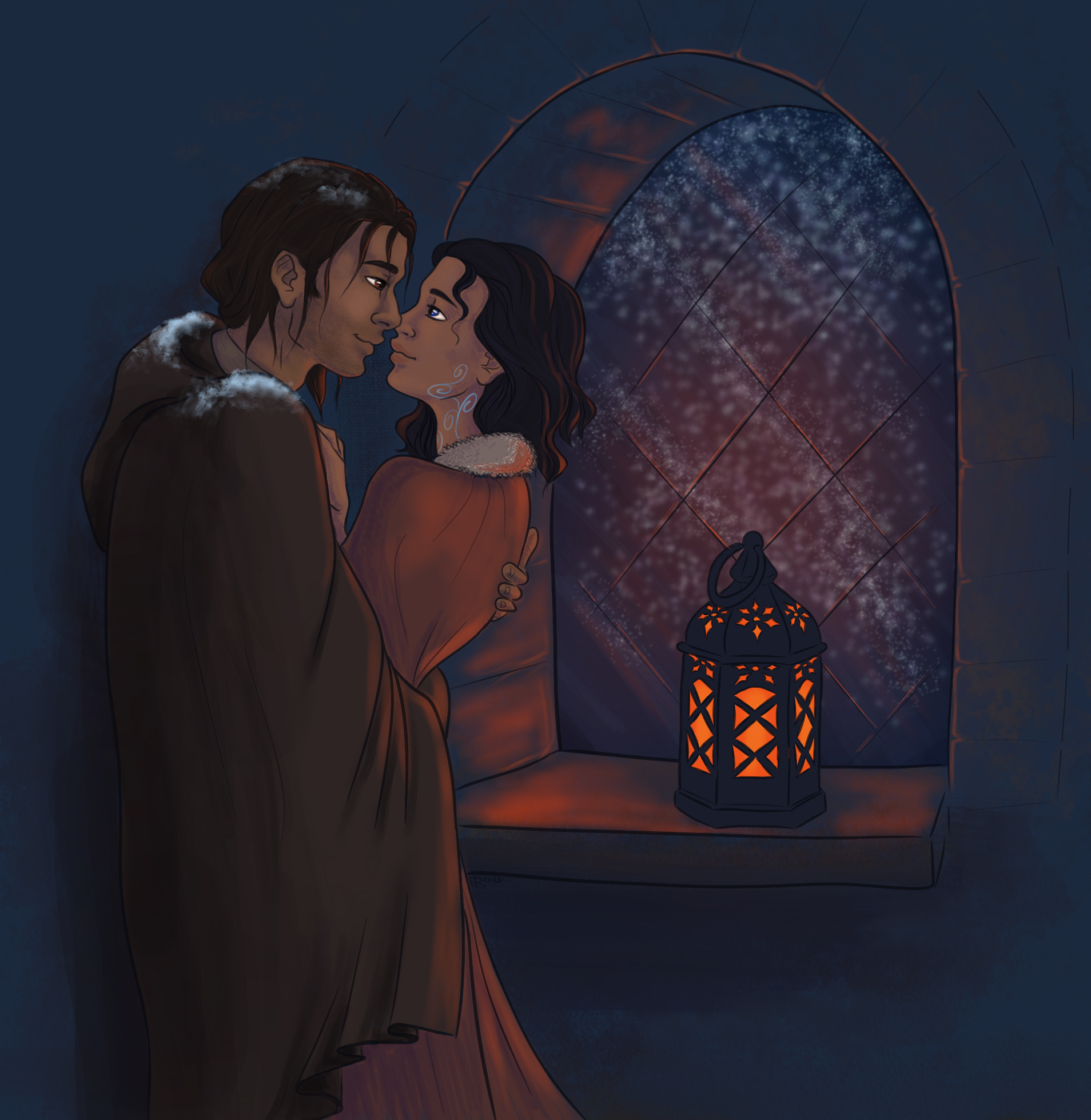 He wrapped his cloak around them both, and she turned around in his embrace. She studied his face in the soft light, the faint smile on his lips, the glow of the lantern reflected in his eyes. The way he looked at her, as if she was something sacred.